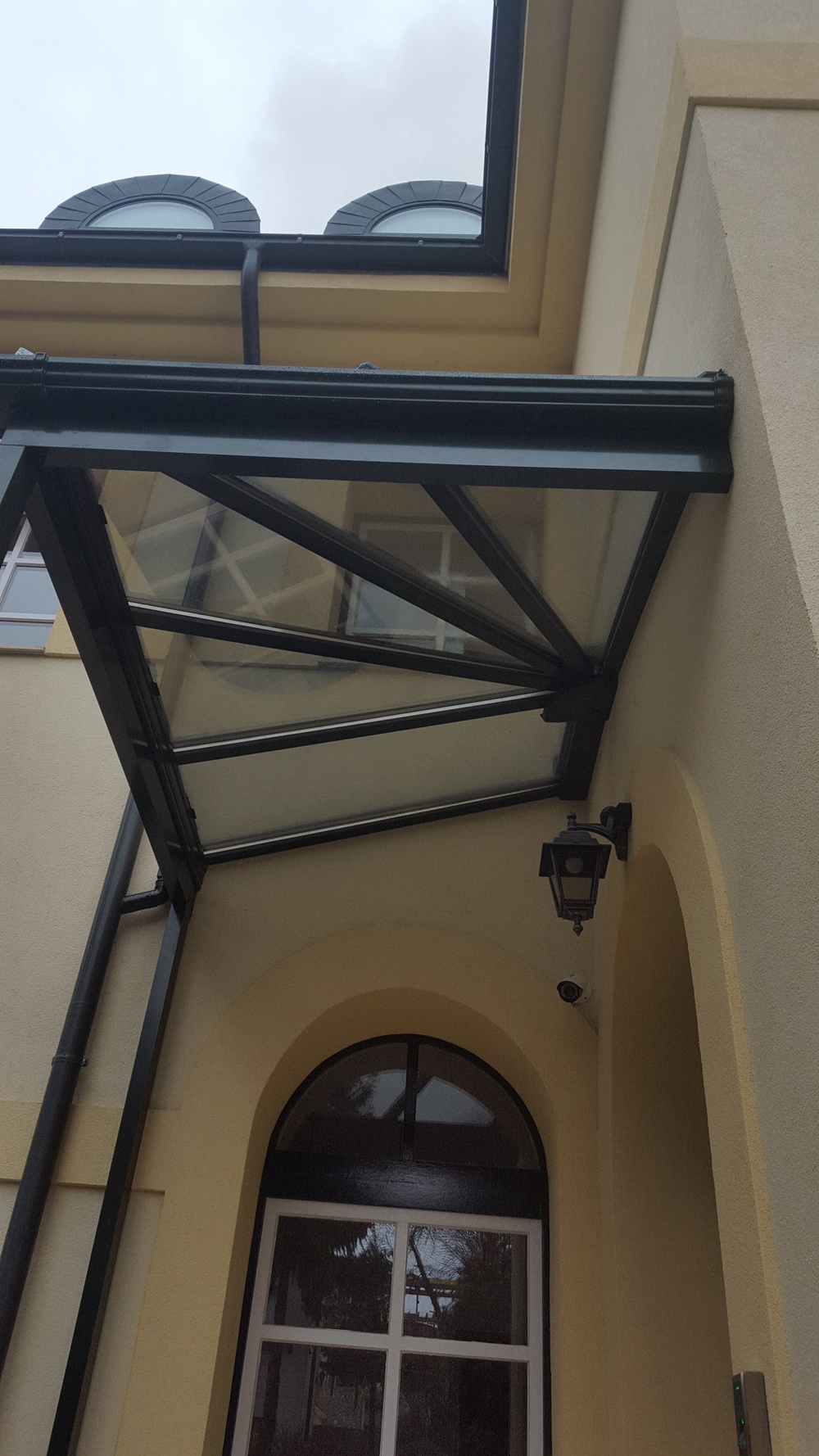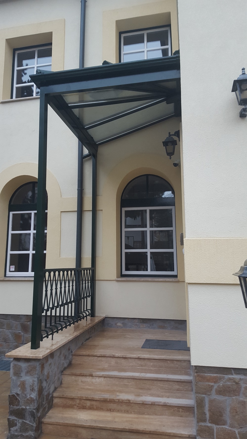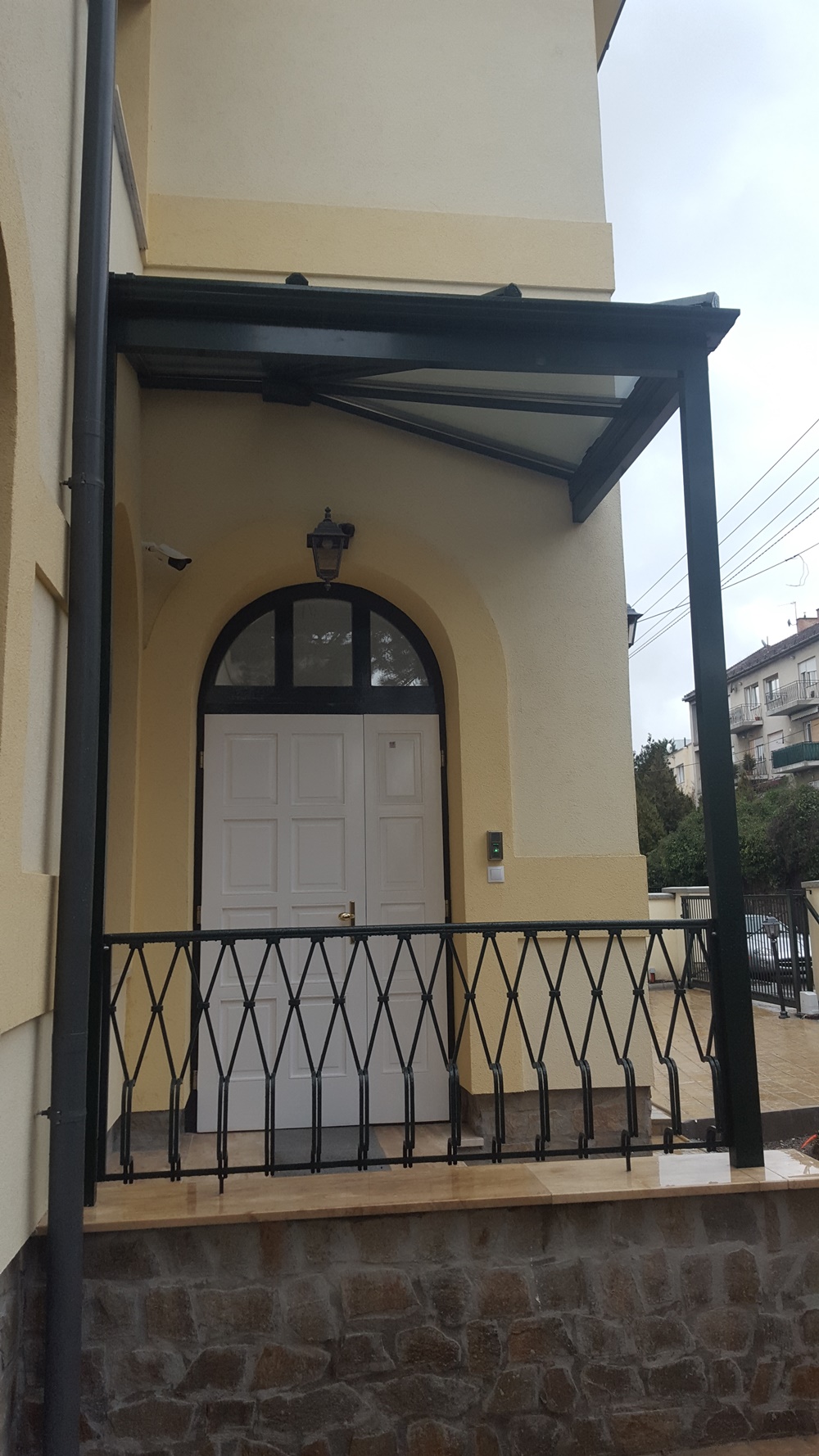 Egyik nap érkezett egy nagyon precíz árajánlatkérés cégünkhöz egy előtető kivitelezésére. Pontos rajzokat, tájolást, méreteket kaptunk így első látásra egyszerűnek tűnt a munka. Telefonos egyeztetés után kiderült, hogy egy szép viktoriánus stílusú, elegáns épület bejáratához készülne az előtető, amit később lehet, hogy szeretnének oldalfalakkal is beépíteni, így a télikert kényelmes bejárást biztosítana az iroda dolgozói és ügyfelei részére. Az elkészült teraszfedés stílusában, megjelenésében is tökéletesen illeszkedik a ház homlokzatához.