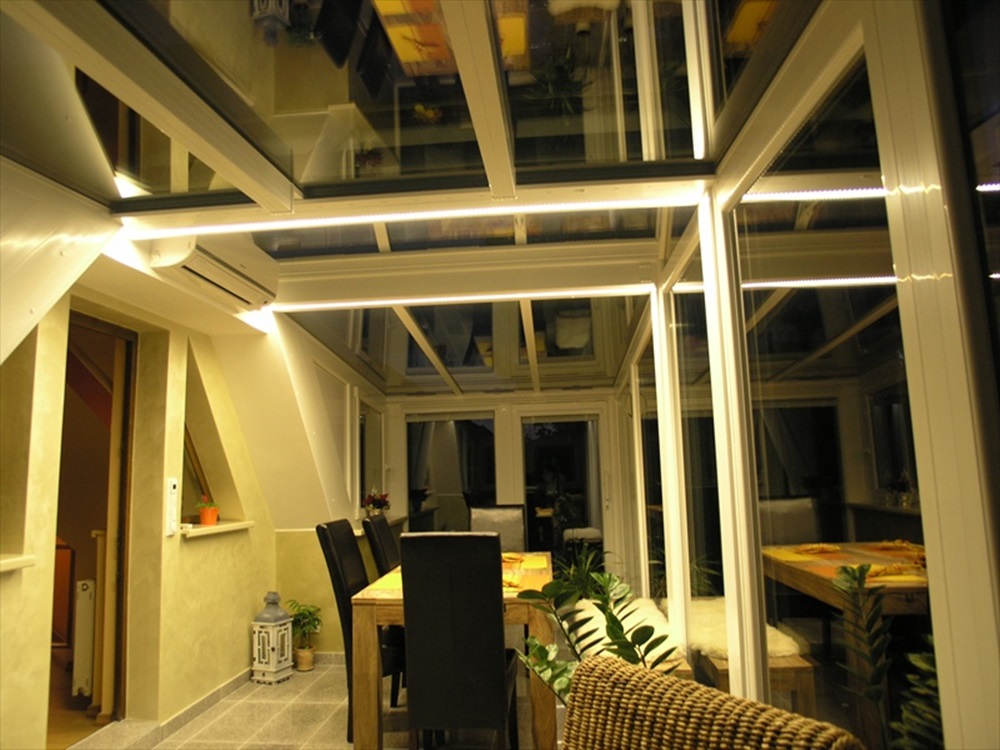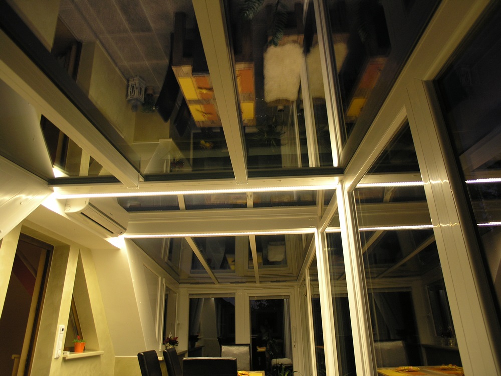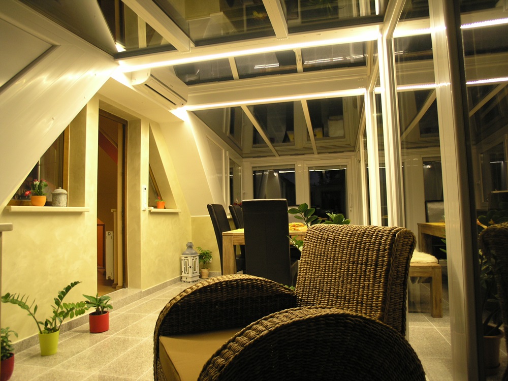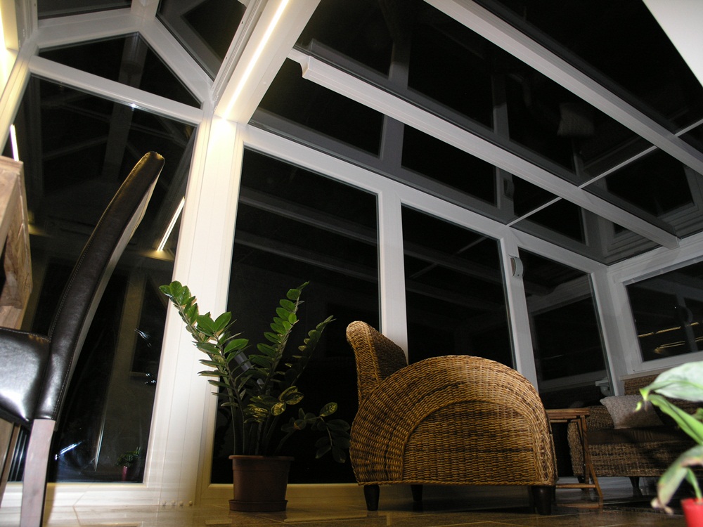 Érdekes részlete a télikertnek, hogy a talajban egy lépésálló üvegtábla van beépítve, hogy a télikerten keresztül az alatta lévő helység is több fényhez jusson ezután. A belső tér két színkombinációja jól kiegészíti egymást. A sötétebb árnyalat a parapetfalon körbe és a világosabb pedig a cseréptető alatti részt hangsúlyozza. A két szín kontrasztját alkotja a világos bézs színű kőpárkány, mely alatt LED világítás fut körbe a télikerten és folytatódik a télikert tetőszerkezetének nyerge alatt. Tökéletes harmóniát és kellemes légkört sikerült a tulajdonosnak teremtenie, melynek hasznát veszi majd az itt eltöltött idő alatt.