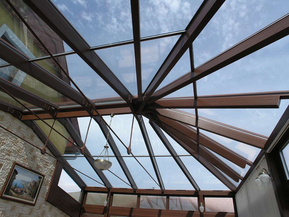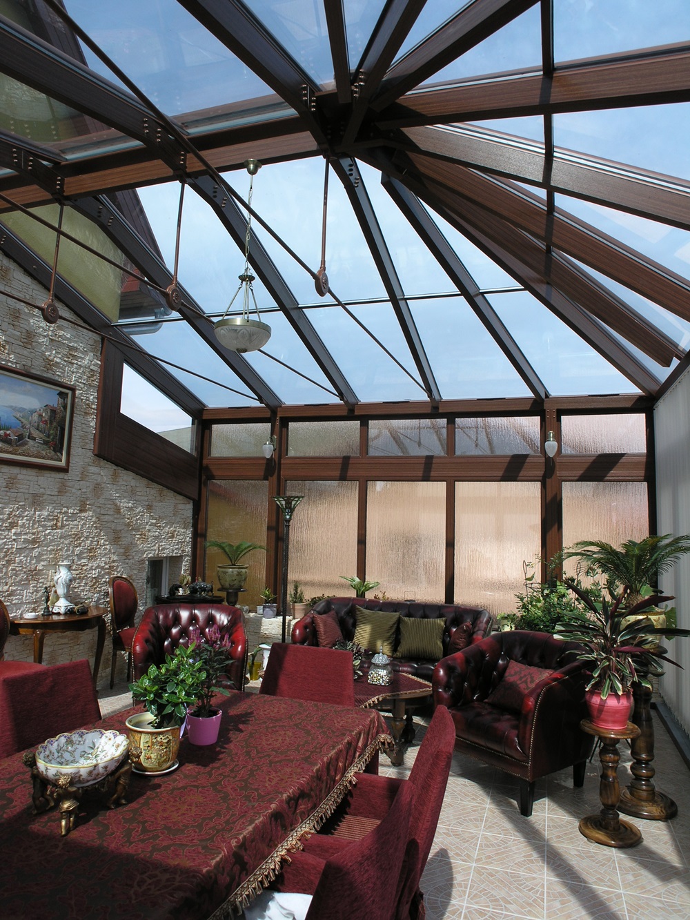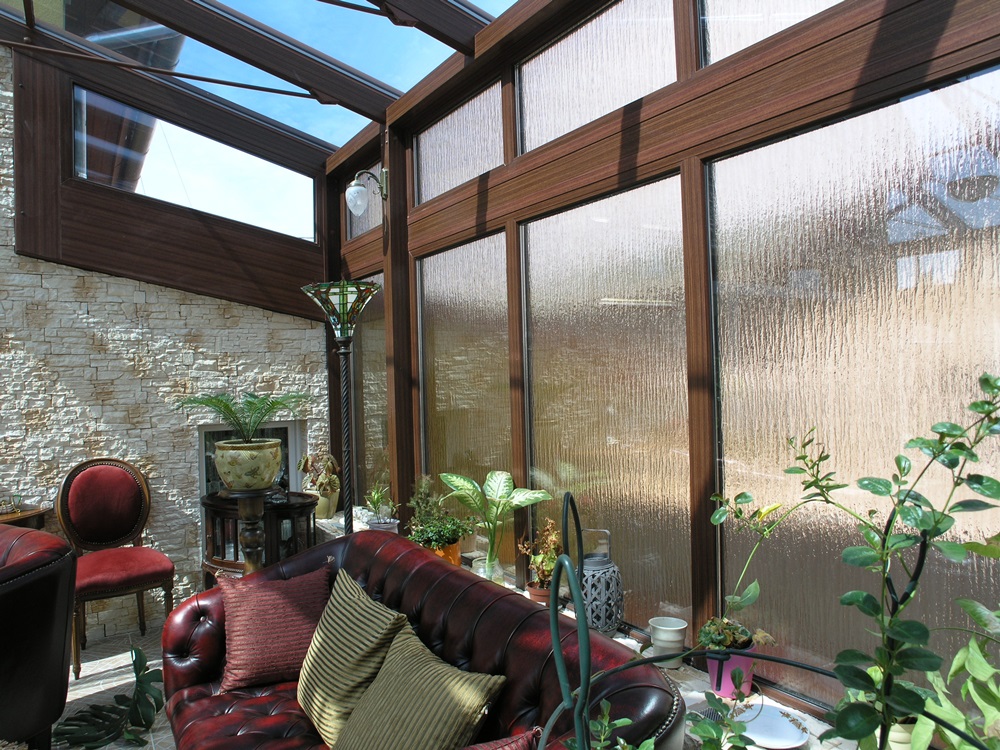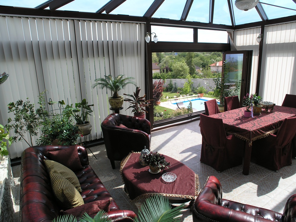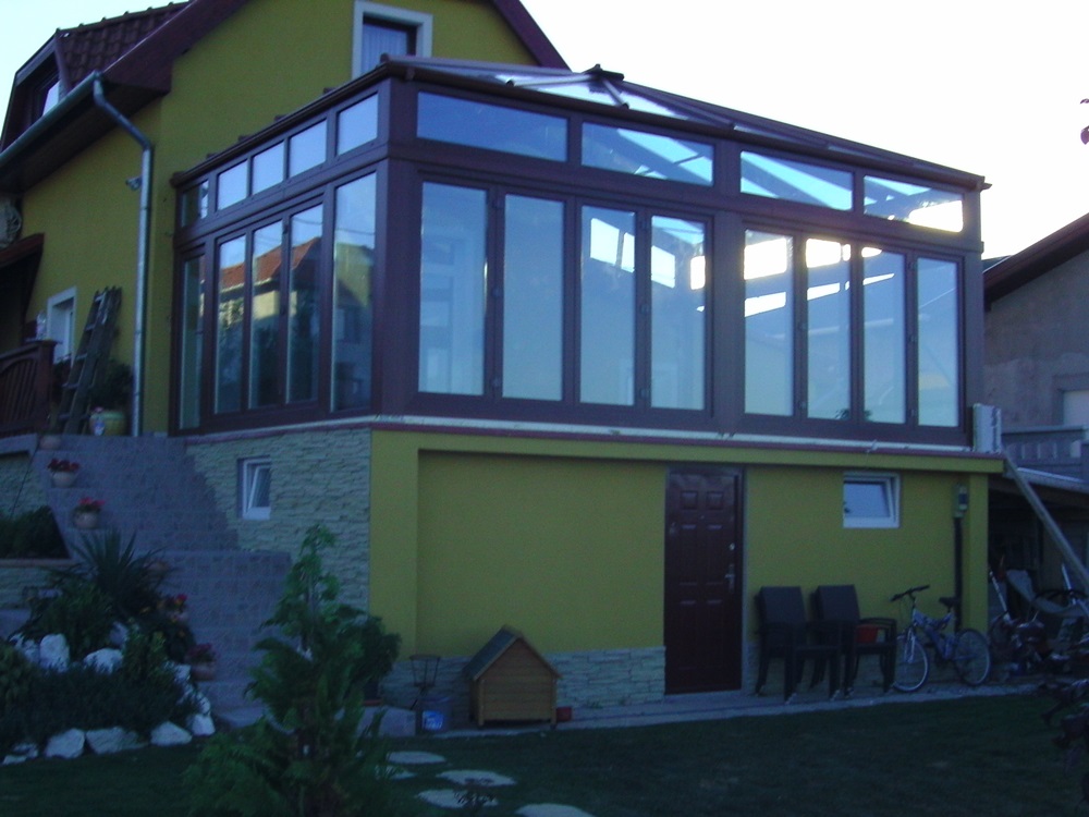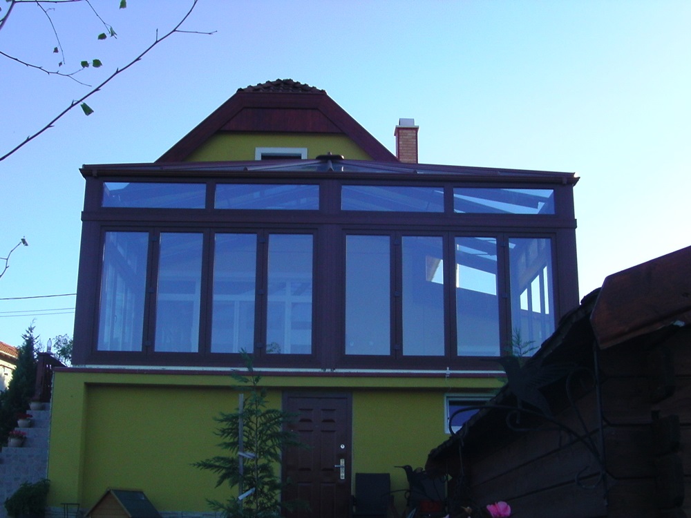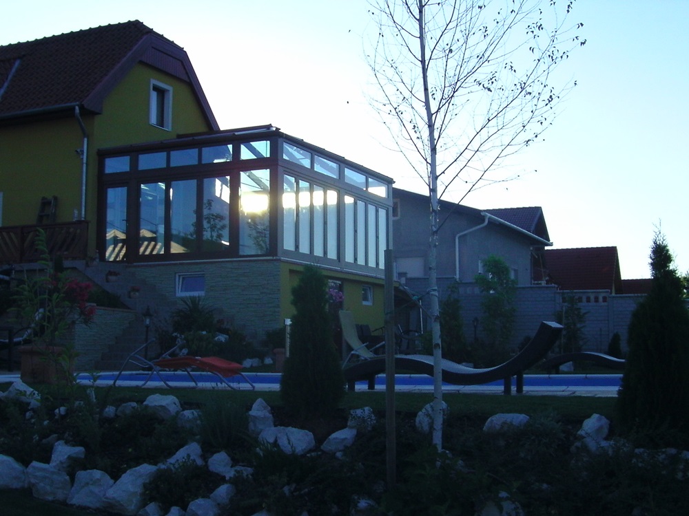 Az elkészült faerezésű alumínium portál szerkezet és a nyeregtetőből induló, legyezőformájú télikert tető nagyon impozáns megjelenést ad a belső térnek. A hatalmas nyílásokká alakítható oldalfalakat harmonika ajtók beépítésével oldottuk meg. Továbbá a szomszéd felé tekintő oldalfalba, fatörzs mintázatú hőszigetelt üveget helyeztünk.