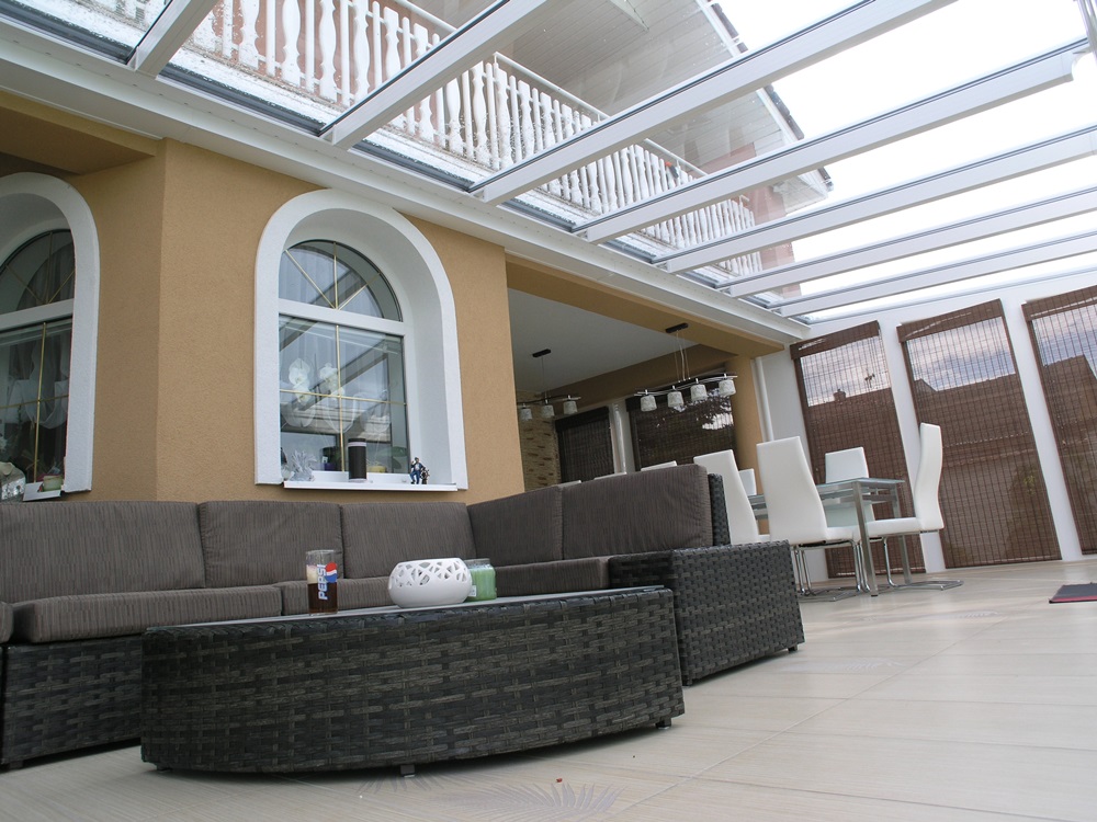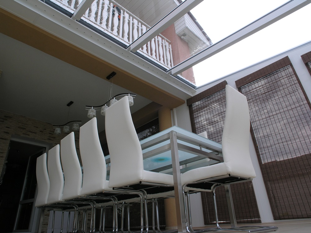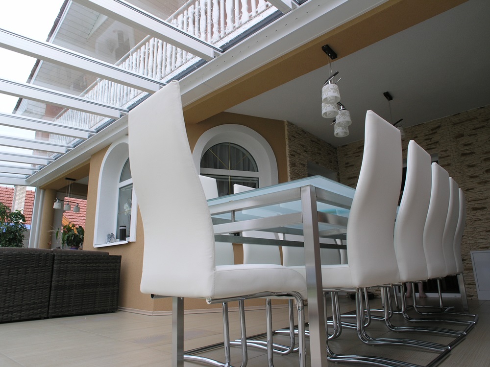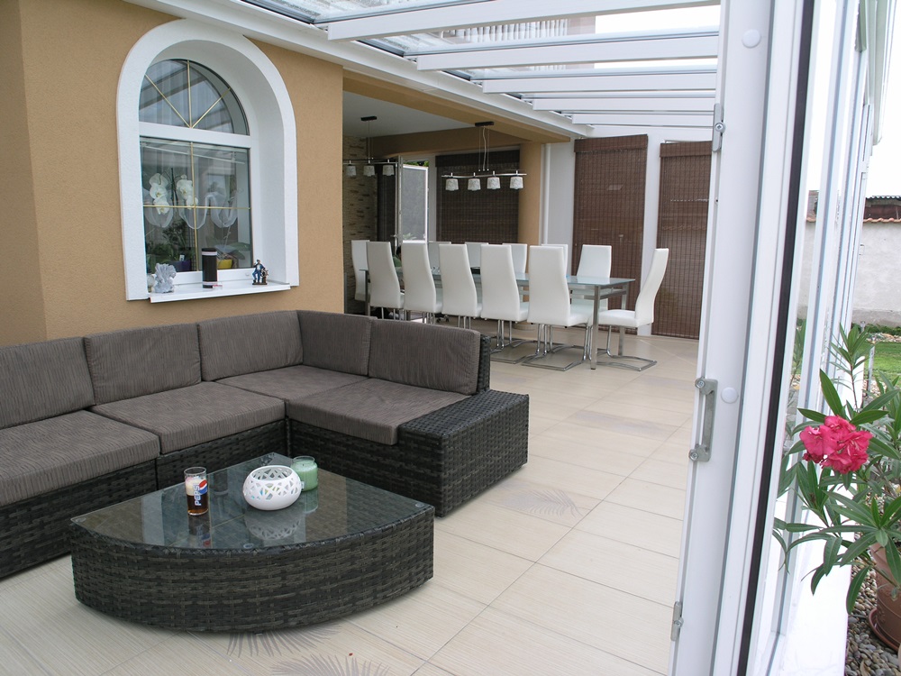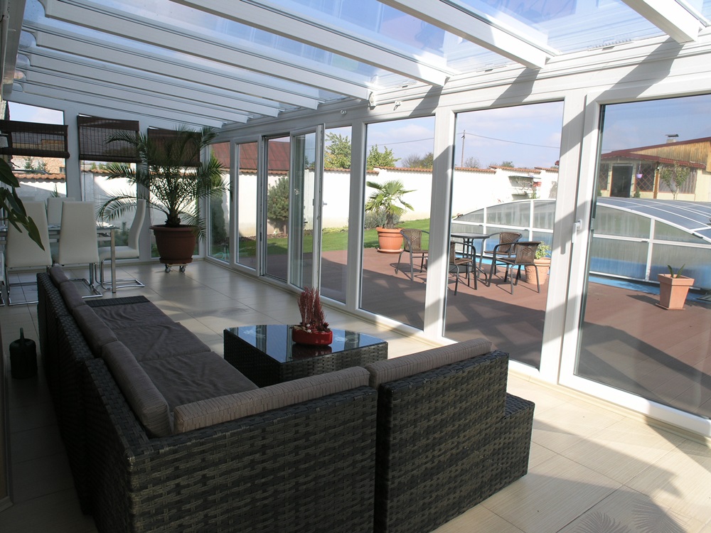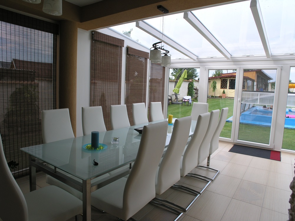 Impozáns és nagyon kellemes télikert büszke tulajdonosa lehet ez a család (is). Nagyobb családi összejövetelekre is alkalmas, de nappali pihenőhelyként szintén szolgálhat, ahonnan szemmel tartható a medencében pancsoló csemete..