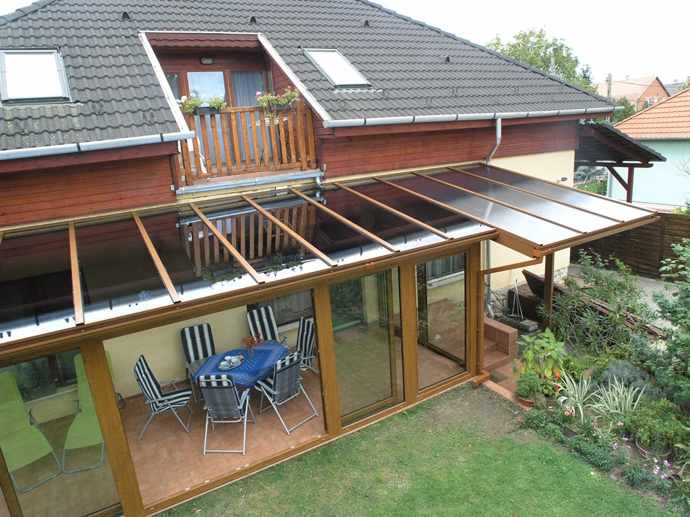 - előtető: Sunwood alumínium tetőrendszer, víztiszta polikarbonáttal, télikert esőcsatorna lefolyóval.