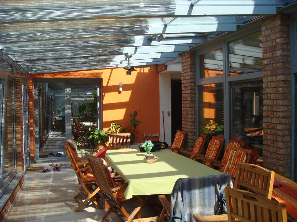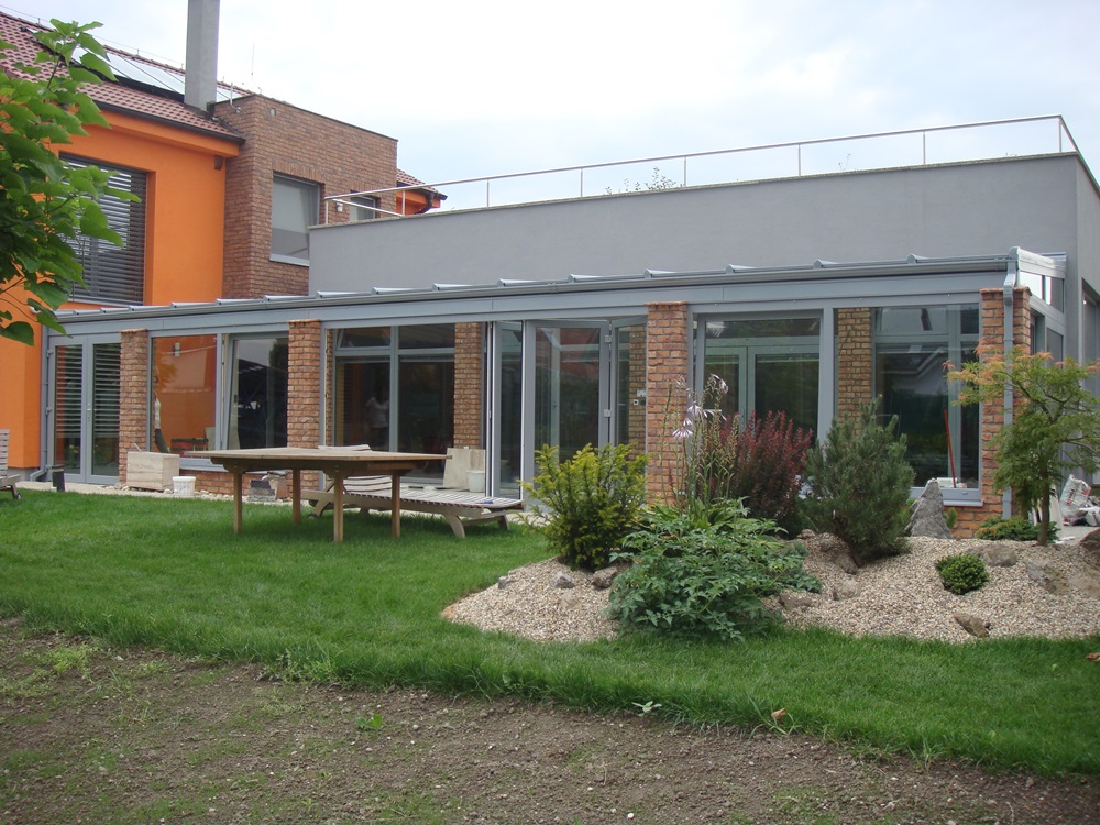 Pozsonyi családi ház tulajonosa keresett fel gondjával, miszerint a ház mellett levő uszodájához szeretne pihenőhelységet létrehozni, de úgy, hogy ne árnyékoljon az uszodának, továbbra is elég fény jusson be. Erre nyújt neki megoldást a télikert – mely egyben átmenet is az udvar és a medence között, valamint külön bejárattal van ellátva a konyha és a télikert közötti átjáró is.