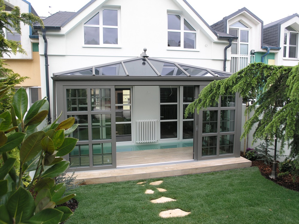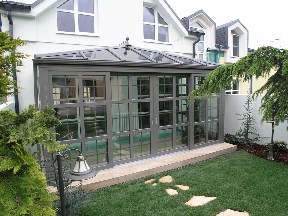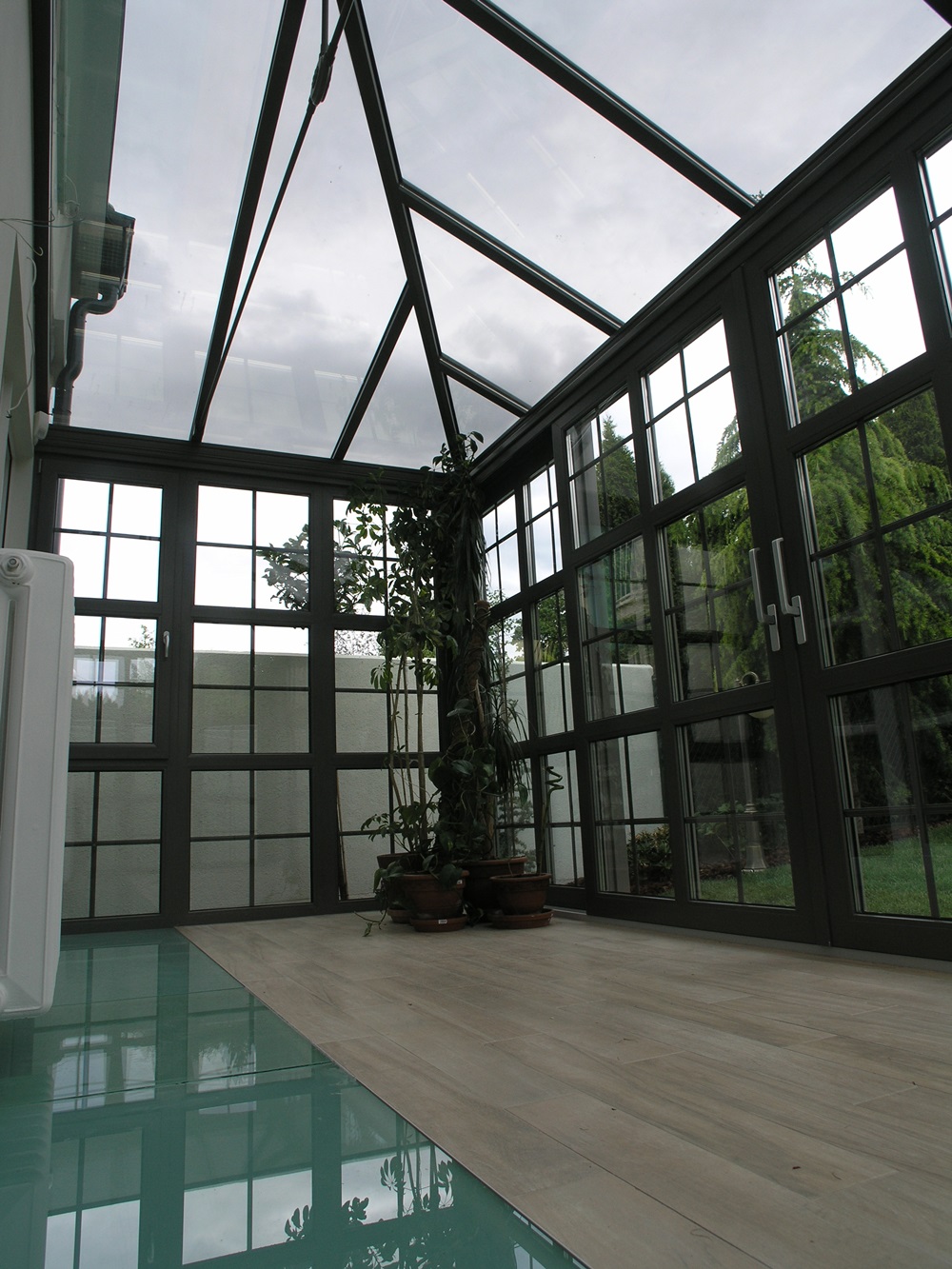 A télikert ajtói, működési funkcióját tekintve emelő toló szerkezetet kaptak, a design pedig angol stílusú sűrű osztású oldalfal üvegezést. További érdekesség, hogy a télikert aljzatának egy része járható üvegfelület, amin keresztül a szuterénba is természetes fény jut. Ez a télikert egy különleges példája, a lakás-kert és a fény kapcsolatának!