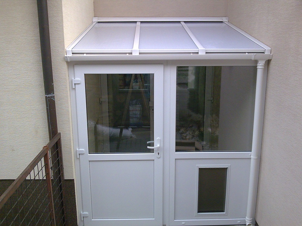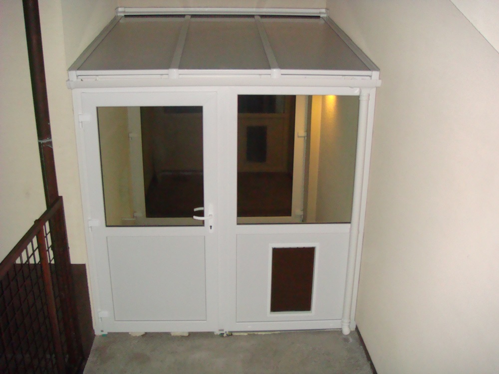 Ez az egyszerű kis télikert egy társas sorház hátsó bejárata – kijárata a kertbe. A tulajdonosok a házikedvencre is gondoltak és meglepték egy külön kutyabejáróval.