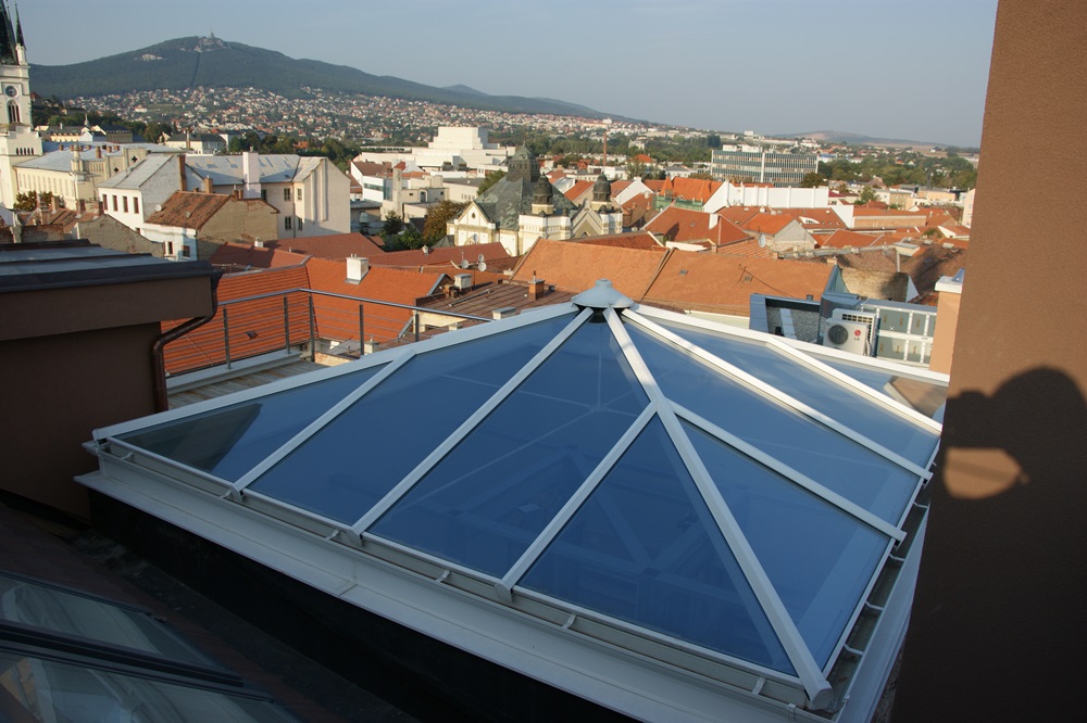 Piramis formájú üvegtetővel van lefedve egy lakóház felvonóaknája és lépcsőháza. Ha a főldszintről felfele nézünk, olyan érzésünk támad, hogy a lift a felülvilágítón keresztül a felhőkig repít bennünket…